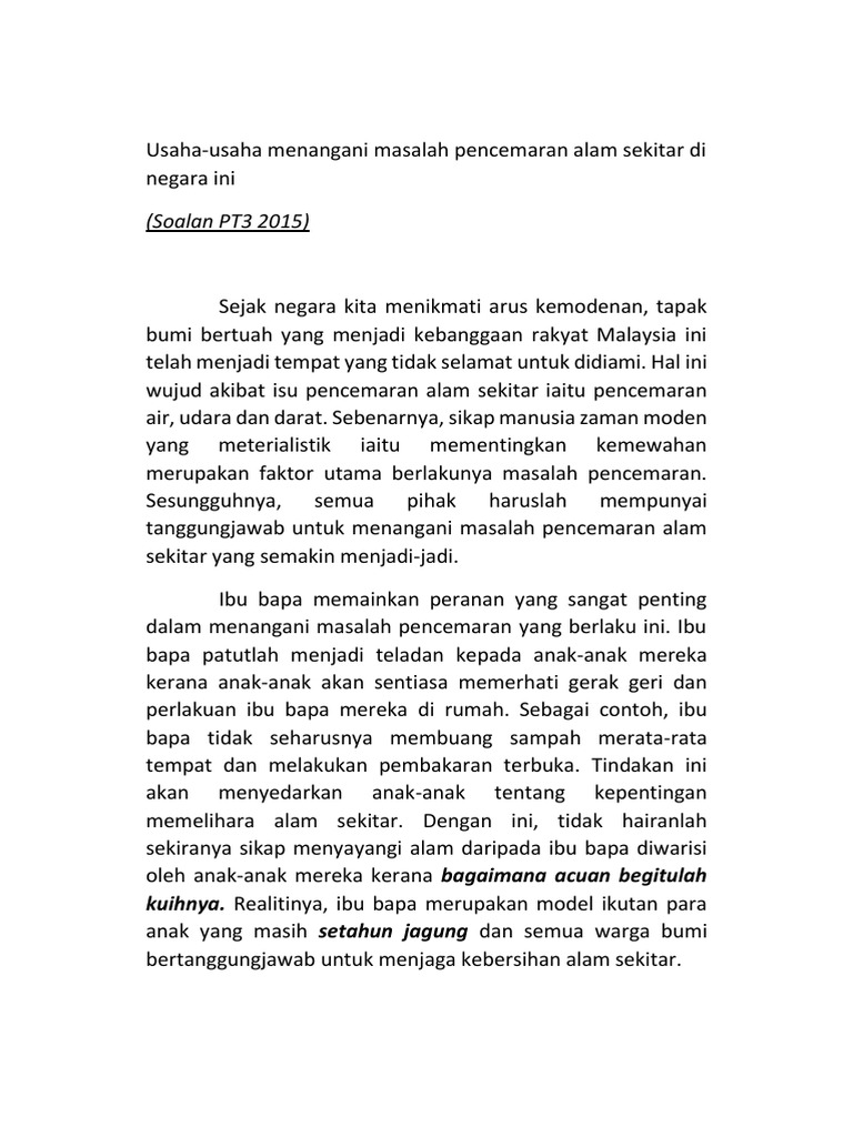 Jelaskan langkah langkah yang patut kita lakukan untuk menjaga kebersihan alam sekitar. Alam sekitar ini termasuklah kawasan-kawasan tumbuhan hijau udara dan air seperti sungai dan laut. Kertas 1 Bahasa Melayu Mulai tahun 2021 Kertas 1 mata pelajaran Bahasa Melayu dalam peperiksaan SPM 11031 akan menggunakan format baharu.